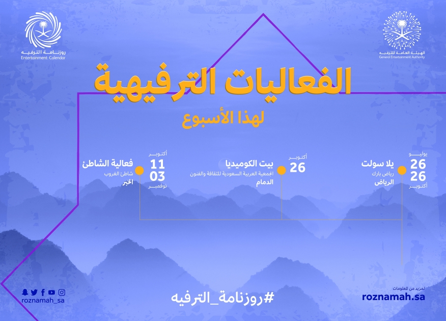 هذا ودعت الهيئة العامة للترفيه الجميع إلى زيارة موقع روزنامة الترفيه www.roznamah.saومتابعة حسابات الروزنامة على قنوات التواصل الاجتماعي @Roznamah_saأو من خلال تحميل تطبيق الروزنامة للأجهزة الذكية من خلال الرابطhttps://land.ly/mnipN9 للاطلاع على المزيد من الأنشطة والفعاليات الترفيهية في الروزنامة.