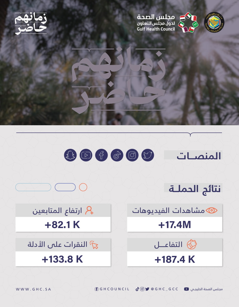 هذا وحققت حملة "زمانهم حاضر" نتائج عالية لعدد مشاهدات فيديو الحملة حيث بلغت أكثر من 17.4 مليون مشاهدة وبتفاعل إيجابي بأكثر من 187.4 ألف، وبالنقر على الأدلة بـ 133،8 ألف مره، وأرتفاع في أعداد المتابعين الجدد لحسابات المجلس بـأكثر من 82.1 الف متابع، وكانت هذه النتائج عبر حسابات مجلس الصحة الخليجي في تويتر وأنستقرام و الفيس بوك و اليوتيوب والتيك توك.
