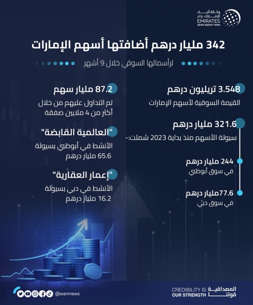 واستقطبت الأسهم المحلية سيولة تجاوزت 321.6 مليار درهم خلال التسعة أشهر الأولى من العام الحالي، توزعت بواقع 243.9 مليار درهم في سوق أبوظبي للأوراق المالية و77.6 مليار درهم في سوق دبي المالي، فيما جرى التداول على نحو 87.2 مليار سهم منها 44.6 مليار سهم في سوق أبوظبي و42.6 مليار سهم في سوق دبي، وذلك من خلال تنفيذ أكثر من 4 ملايين صفقة في السوقين.