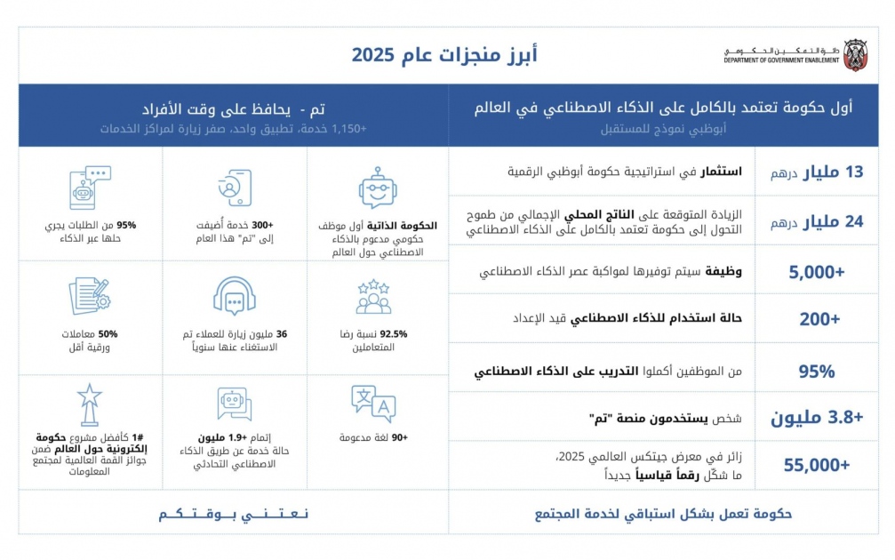 وأضاف معاليه: شكّل 2025 عاماً فارقاً، حيث نفخر بجهودنا في دائرة التمكين الحكومي بتسخير الإمكانات والتعاون مع كافة الجهات من أجل تسهيل خدمات المتعاملين والارتقاء بجودة حياة أفراد المجتمع لتأكيد مكانة أبوظبي كنموذج عالمي للحكومات التي تعتمد بالكامل على الذكاء الاصطناعي.