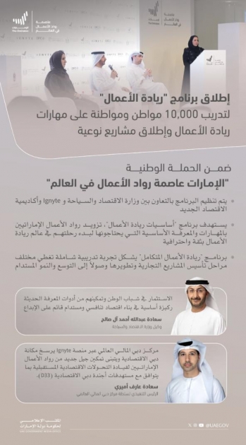 ويأتي البرنامج ضمن الحملة الوطنية "الإمارات عاصمة رواد الأعمال في العالم"، التي أطلقها صاحب السمو الشيخ محمد بن راشد آل مكتوم، نائب رئيس الدولة، رئيس مجلس الوزراء، حاكم دبي، "رعاه الله"، بهدف ترسيخ مكانة دولة الإمارات كوجهة عالمية لريادة الأعمال، من خلال مجموعة متكاملة من البرامج والمبادرات التي تدعم الشباب الإماراتي وتُمكّنهم من تأسيس المشاريع، وتحفّز الابتكار، وتُسهم في تنويع الاقتصاد الوطني.