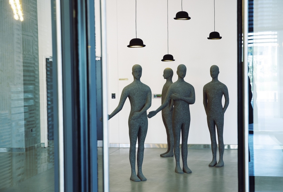 ALWAYS ON: The vast open-plan lobby provides the perfect location for catch-ups with colleagues, clients or friends – or a one-on-one with your laptop if you can keep your thumbs away from the Camera app. From the group of human sculptures raising their hats to you as you enter the hotel, to the abstract art display called the ‘cityscape’ which portrays Dubai’s transformation and the stereos that adorn the reception desk and the spa, there’s design details to inspire at every turn.