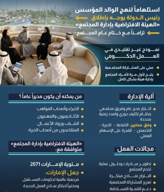 President His Highness Sheikh Mohamed bin Zayed Al Nahyan has directed the launch of the Community-Managed Virtual Authority, a new initiative inspired by the vision of the UAE’s Founding Father, the late Sheikh Zayed, to enhance the role of skilled individuals in shaping the nation's future. The announcement coincides with the conclusion of the Year of Community.